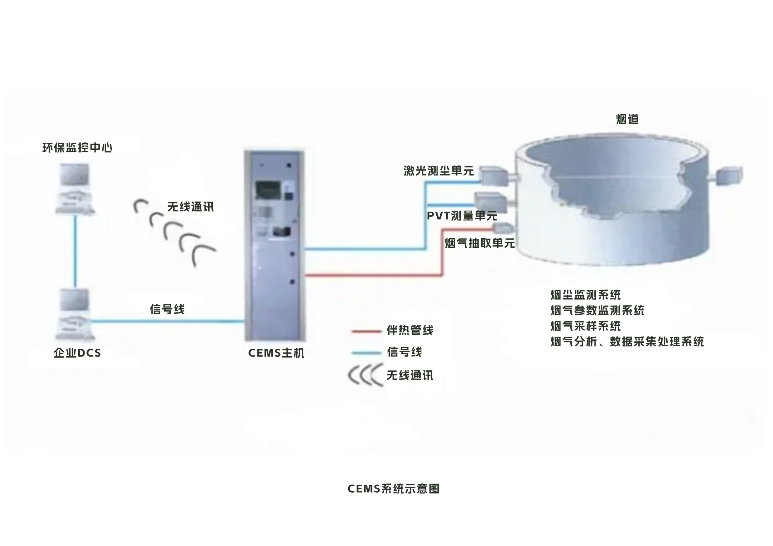 CEMS主要由煙氣參數(shù)測量子系統(tǒng)、顆粒物CEMS、氣態(tài)污染物CEMS、數(shù)據(jù)采集與傳輸?shù)葐卧啥?,形成一個集數(shù)據(jù)采集、處理、顯示、通訊、遠程監(jiān)控的一體化系統(tǒng)。